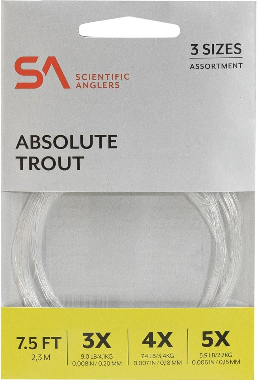 Absolute leaders are made with proprietary copolymer blends that are designed to drastically reduce water absorption while maintaining an optimal suppleness for high knot strength Absolute nylon leaders and tippet have a 29 higher wet knot strength compared to our previous material and up to 40 higher wet knot strength when compared to our competitors Our new paper based leader packaging is now 100 recyclable All materials inks and window are fully biodegradable to protect our streams and reduce our environmental footprint Please don t litter Money saving 3 Pack leader Bundle Tapers specifically designed for Trout fishing Updated butt diameters pair perfectly with modern trout fly lines Supple material for drag free drifts Up to 40 stronger wet knot strength than competition Material: Nylon Water Type: Freshwater Fishing Type: Dries Indicators Nymphs Big Dries General Stillwater Length: 7 5 ft Species: Trout